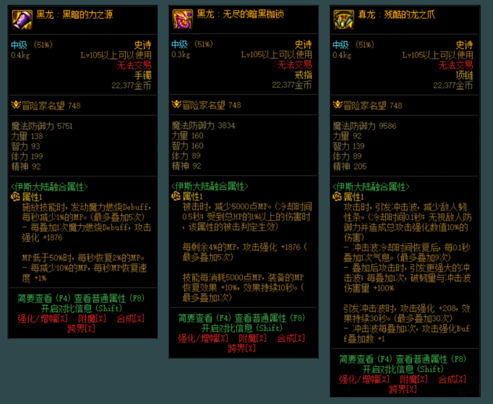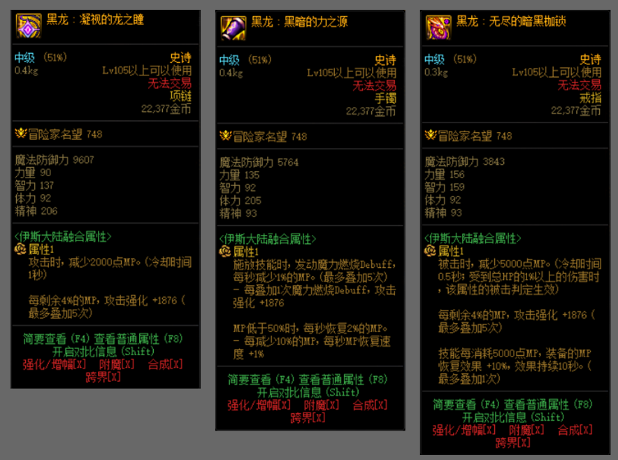 MP流搭配黑龙3,蓝量消耗很大,像刃影本身MP流都不够一套技能,比较适合蓝量消耗少的职业使用,所以一般黑龙不建议带3件套,特别是打军团容易不够蓝量爆发输出。但黑龙手镯单挂狂蓝效果非常好用。