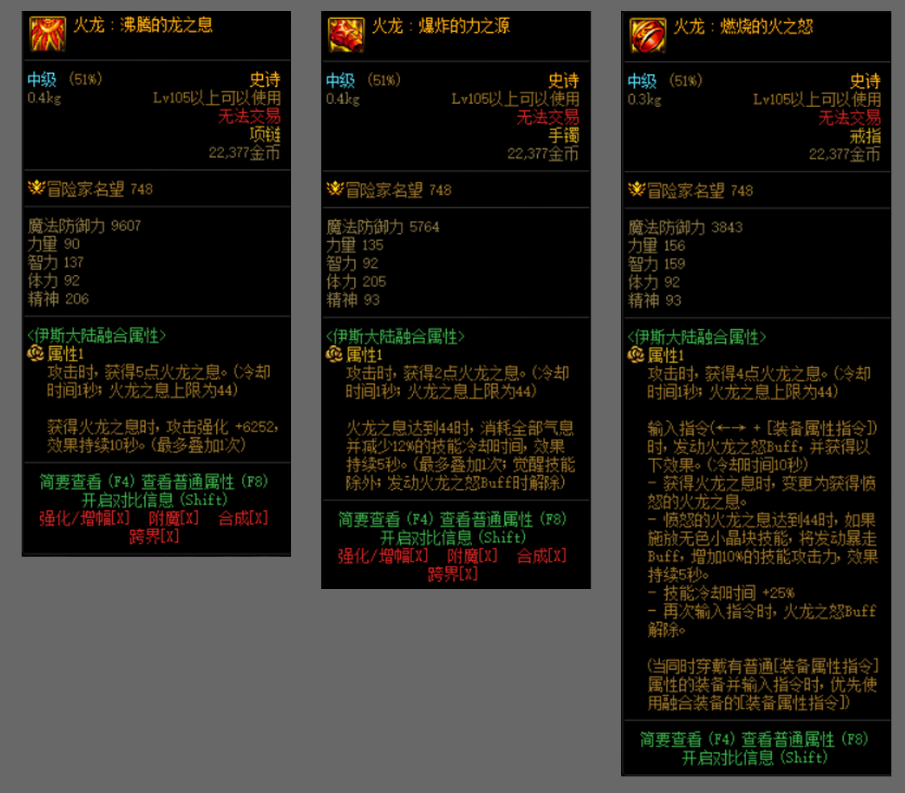 火龙套需要叠加火龙之息,3个部位同时贴膜火龙4秒可以快速叠满44层,增加攻击强化和减少技能CD,戒指可以主动切换增加技能攻击力,可爆发,可续航,但搭配限制比较大。