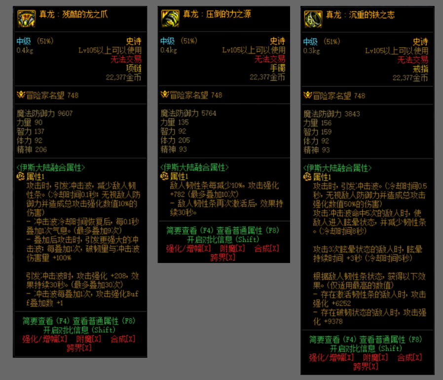 黑龙手镯+真龙项链+火龙戒指 ,黑龙手镯叠满增加9380攻击强化,真龙项链叠加后增加6240攻击强化,项链叠满气息后可以主动切换获得5秒短暂增加10%技攻的爆发输出。