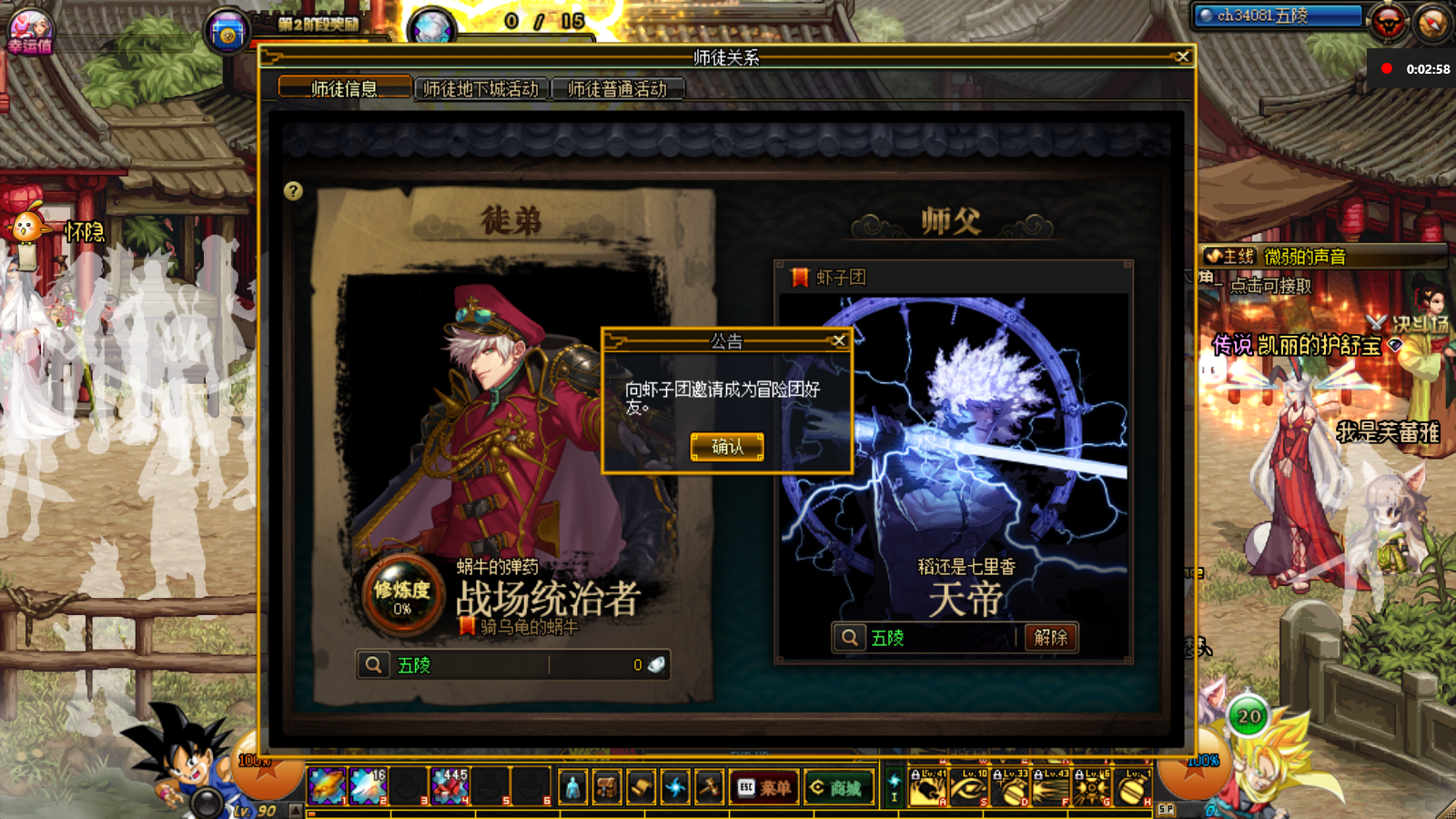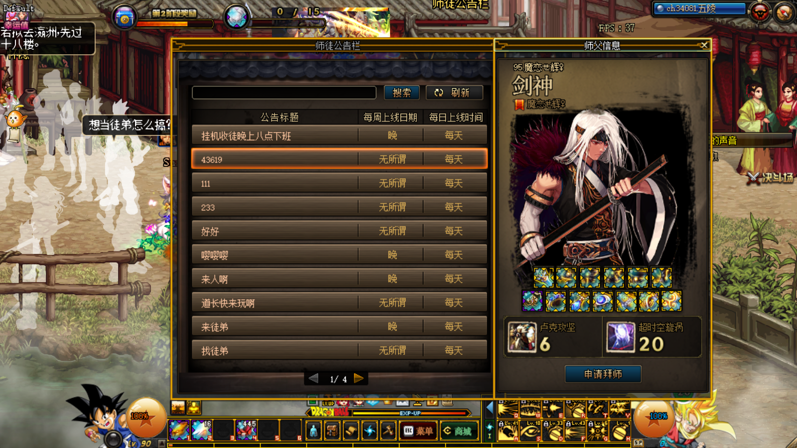 选择一个公告查看,可以看到招募的信息,选择一个你需要的师父点击申请拜师,申请通过技可以查看到师徒系统啦,在菜单栏中的师徒关系功能也可以正常使用,可以查看到当前的关系。