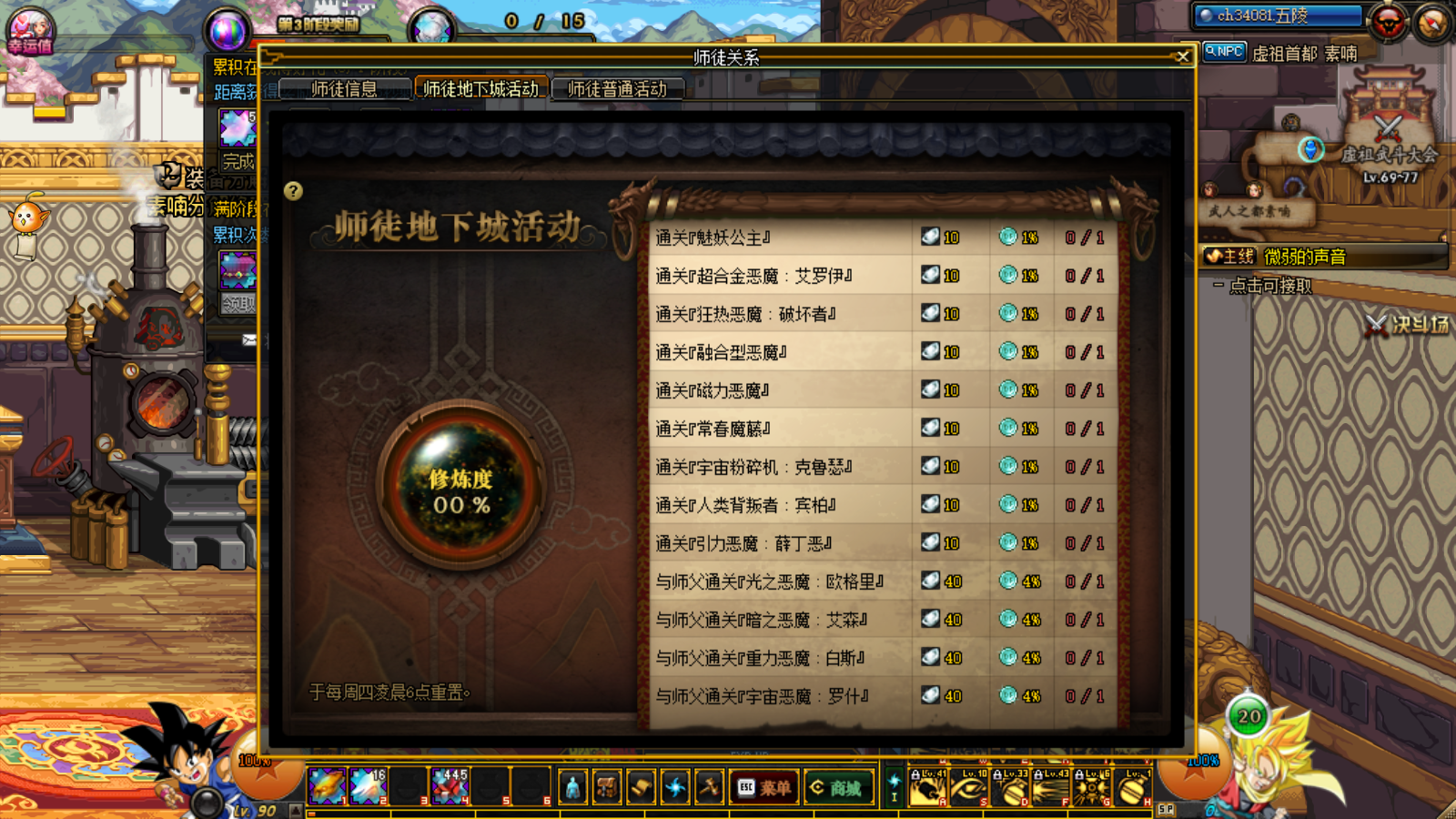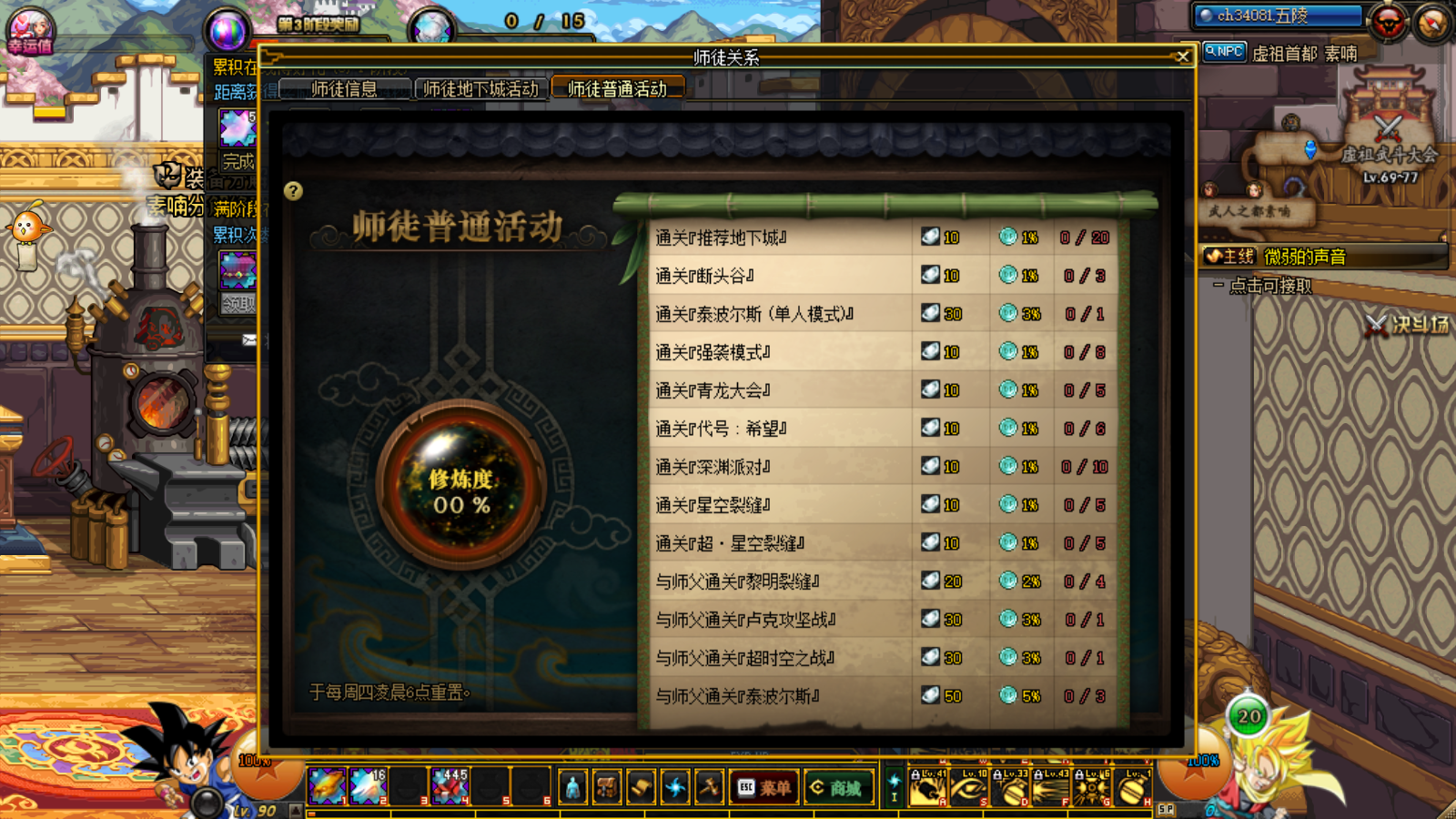 在师徒关系菜单中,我们可以看到了两种任务,一个是师徒地下城任务,一个是普通任务。通关任务可以获得徒弟通宝,拜师成功就可以获得20个了,任务为每周任务,每周四更新刷新重置。