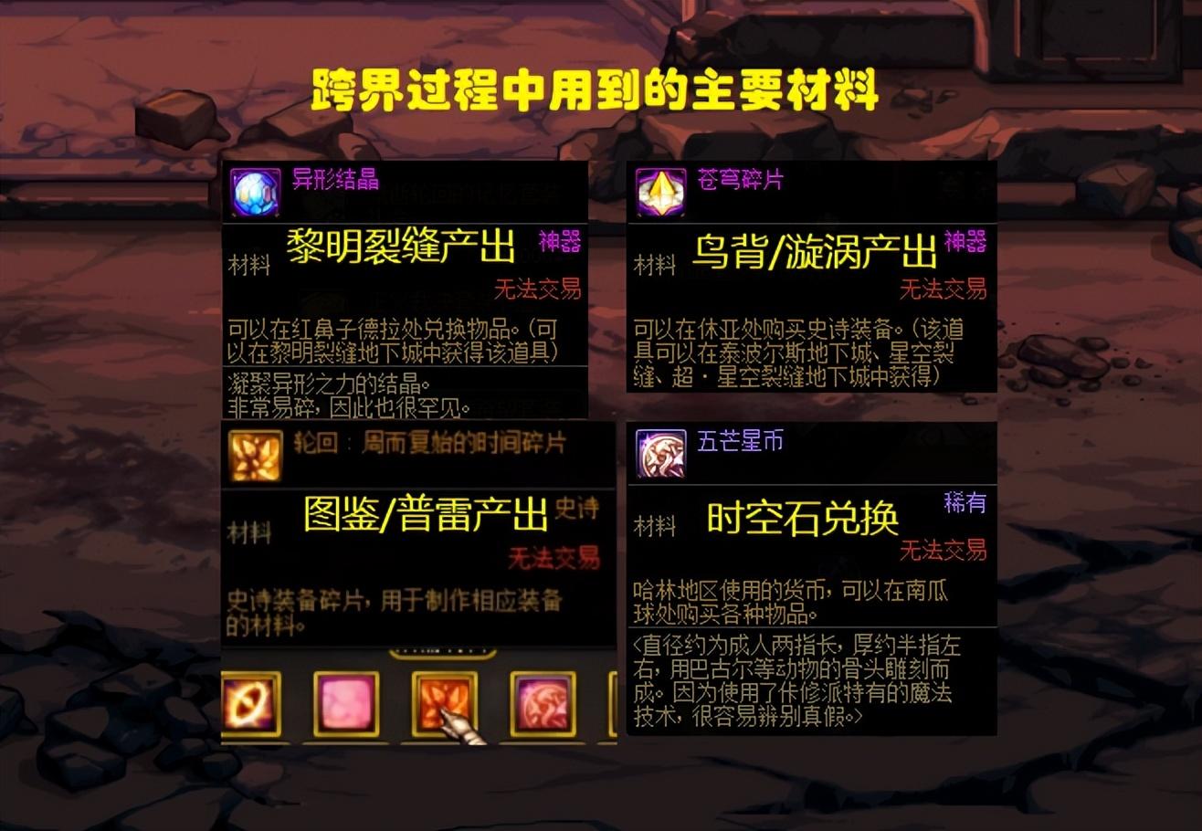在跨界流程中,需要用到三种材料,“750个异形结晶、480个苍穹碎片、144个史诗碎片”,对于很多玩家来说,由于版本更迭,早就把这些材料丢商店了,或者换装备胚子增幅了,仓库里根本就没有这些材料了(ps:秀儿的材料全丢了,呜呜)