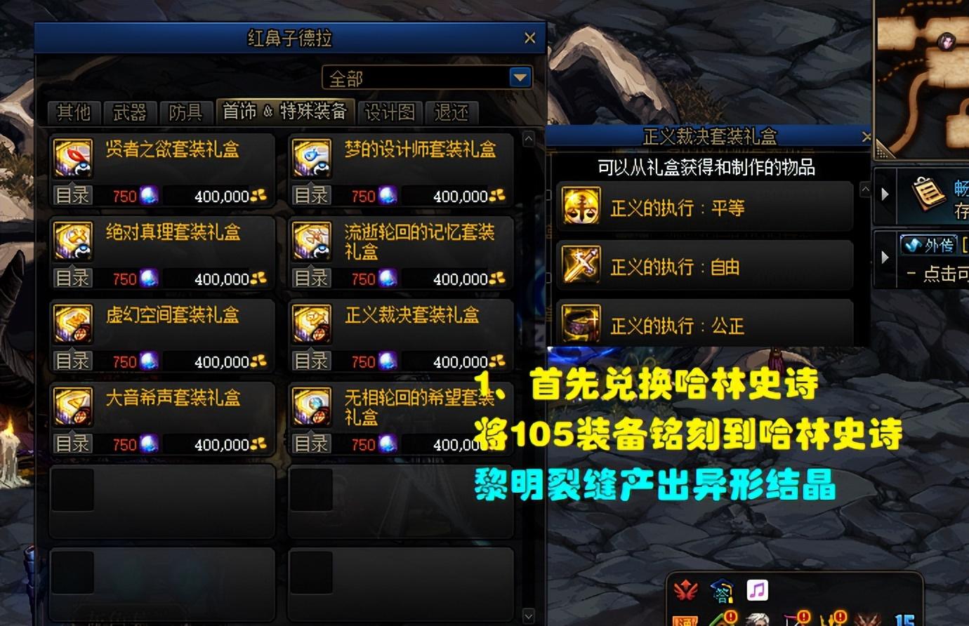 【步骤1】:在NPC红鼻子德拉处兑换一件哈林耳环史诗,需要750异形结晶+40万金币!注意,这里有3件耳环可选择,需要和后续的耳环设计图相对应。