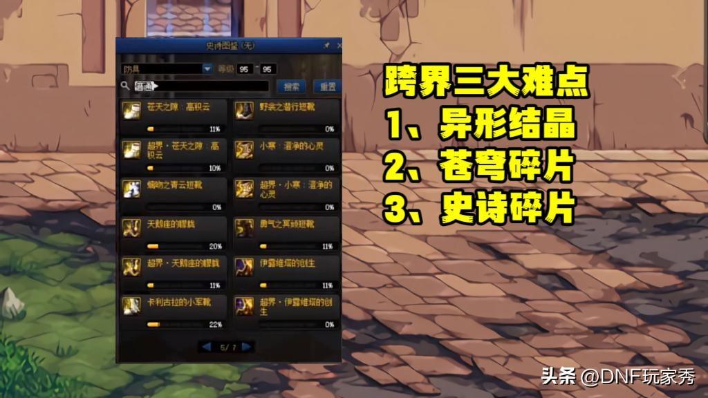 【史诗碎片 】查看史诗碎片图鉴,选择自己碎片最多的史诗进行跨界,如果还不够,就只能“刷深渊,制作对应史诗”,分解对应装备获得碎片。