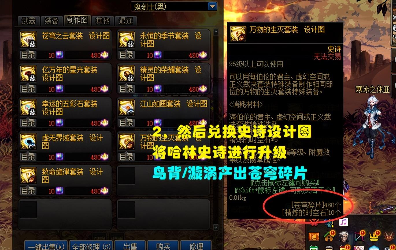 【步骤2】:在NPC寒冰之休亚处兑换一张相对应的耳环设计图 ,需要10个时空精炼石+480个苍穹碎片!比如上面选择了正义制裁耳环,这里就选择对应的万物生灭套装设计图,然后把哈林史诗升级为95A史诗。