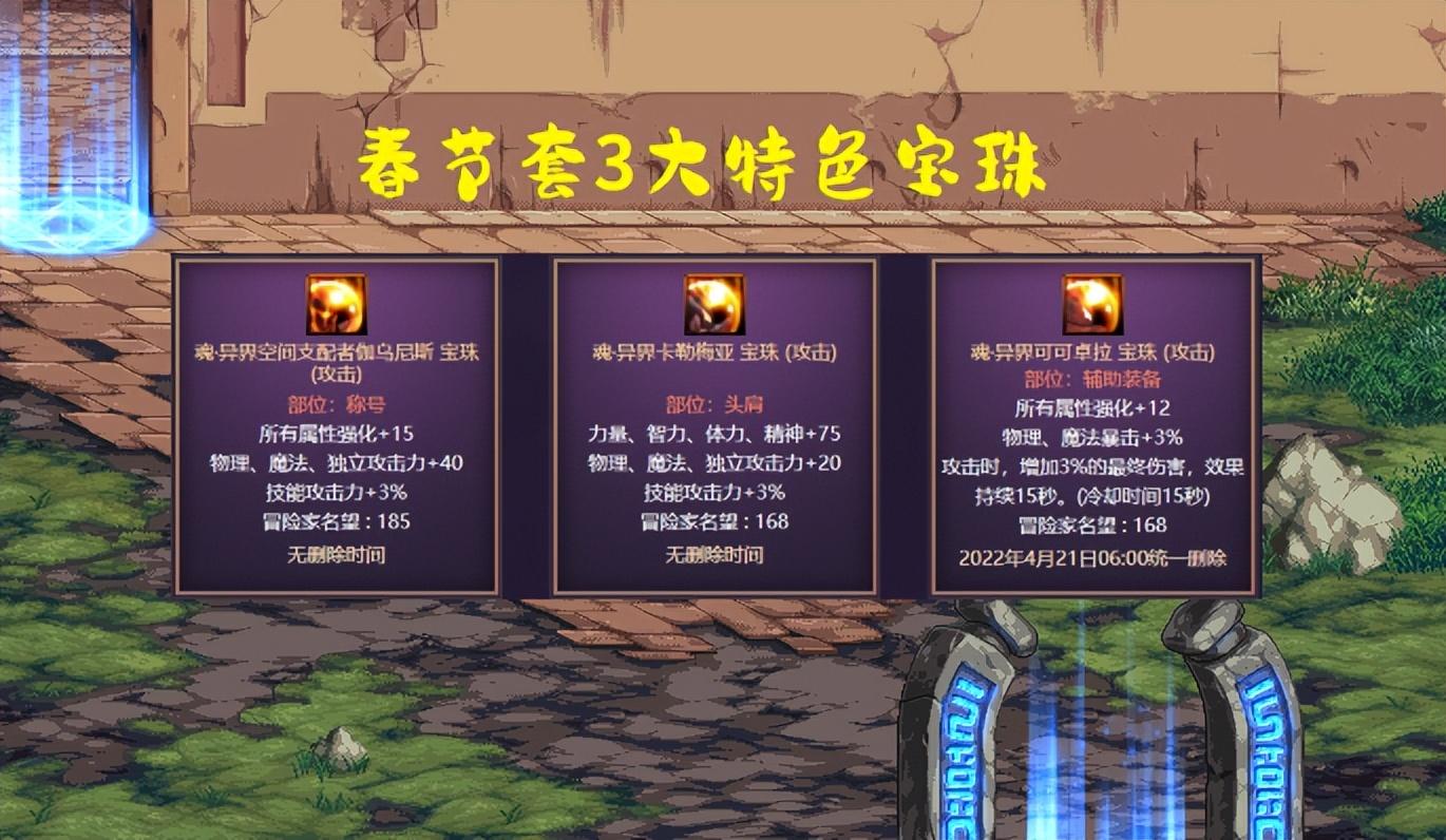 (2)特色宝珠!春节礼包主打称号、头肩、左槽宝珠,其实已经好多年都没有加强过了,但今年可能不一样,巴卡尔团本的左槽宝珠,属性已经持平春节宝珠了,所以今年的左槽宝珠,有很大概率加强。