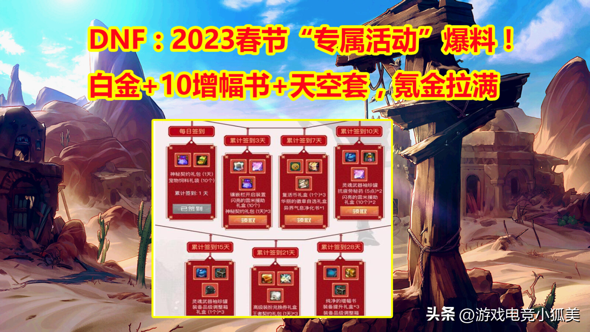 活动1月4号开始,预测元旦助手爆料,5号体验服更新,毕竟现在消息都保密的。目前这些活动大部分都是和去年的差不多,今年的好像还阉割掉了+12的增幅书。“地下城与勇士只小狐狸君爱谈游戏电竞”第三千四百四十五期《DNF:2023春节“专属活动”爆料!4大玩法齐上线,白金+增幅书奖励 》,老规矩搞快点,直接上本次春节版本新增专属活动和奖励的实测截图展示: