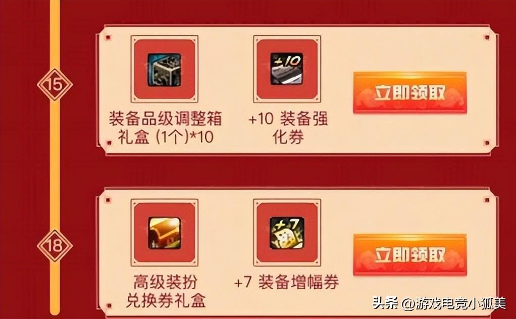 第二个板块对应的点灯活动。点亮18个灯笼就可以把奖励全部拿走,这个都是基础奖励,增幅箱子、+10强化书、+7增幅书、疲劳药剂、高级时装兑换书和调整箱,都是非常不错的。