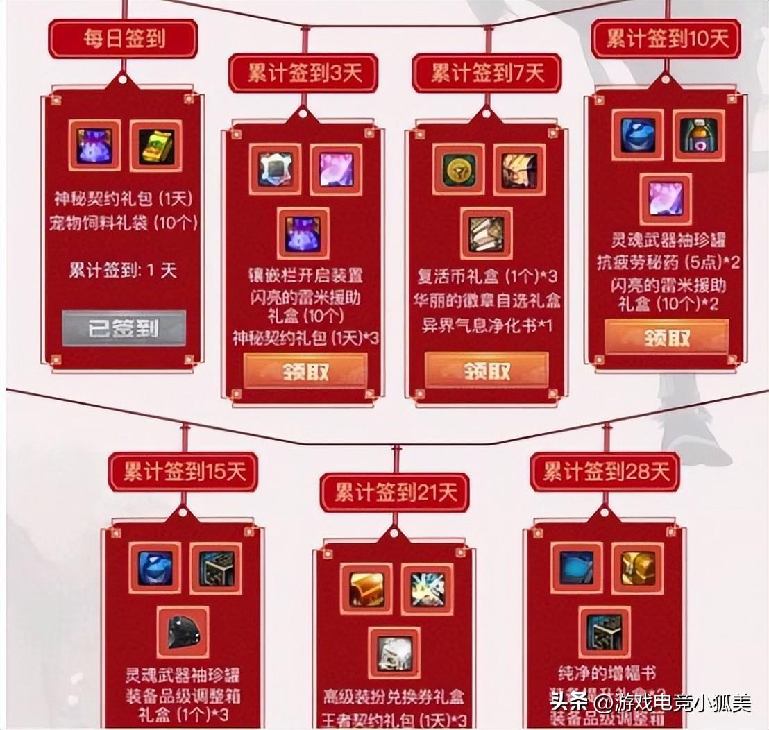 第四个板块,28天签到活动,这个奖励还是比较不错的,增幅书、时装、黑钻、灵魂武器……都是比较实用的。