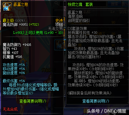 而对于右边的装备可能对于五件超大陆的玩家来说,恍惚套这是必然的,而我们知道氤氲之息项链本身加成最终伤害5%,而每提升1点强化或者增幅等级,就会额外的增加1%的最终伤害,所以氤氲之息项链最终会增加17%的最终伤害。对于强化或者增幅12,我想每一个拥有恍惚套的玩家都会尽自己最大的努力,不管是强化还是增幅,都会达到12,因为这样才能达到恍惚套的最佳伤害。所以,这样超大陆恍惚套最终伤害会增加70%。