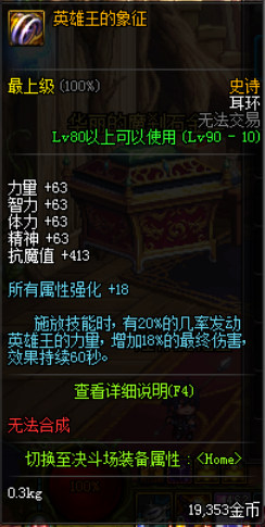 1:英雄王,不是很高的四维,全属强加18,基本全程的20%的最终伤害,使得它成为了90版本三神器之一,对于全职业来说,提升在27%左右,百分比职业比固伤职业更吃香一些,如果爆到了,完全可以作为毕业耳环