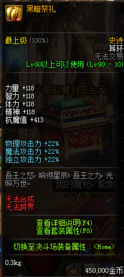 4:黑暗祭礼,海博伦耳环,单件属性可以和英雄王媲美,很多玩家在升级完B套以后,都会选择先换取海博伦耳环,而不是升级武器,尤其是奶爸奶妈,这是非常聪明的做法,非常适合耳环没有英雄王和混沌的玩家,但是制作周期长,佩戴优先级往后放