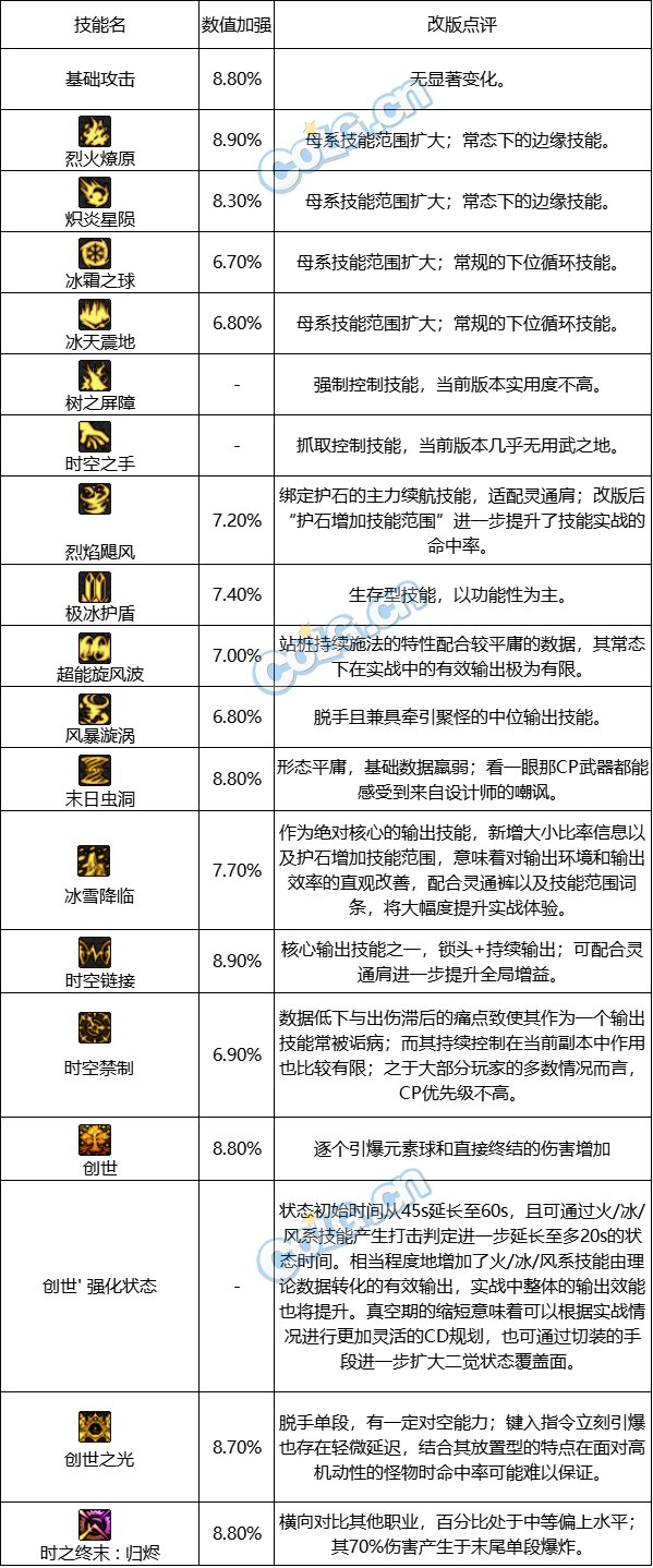 1.基础数值改动: 各技能加强幅度在6.7%~8.9%之间,整体约8%。其中冰雪降临7.7%,时空链接8.9%,烈焰飓风7.2%,50/85/100主动均为8.8%。2.技能改动点评: 烈炎/冰霜/控制/虚空