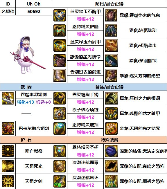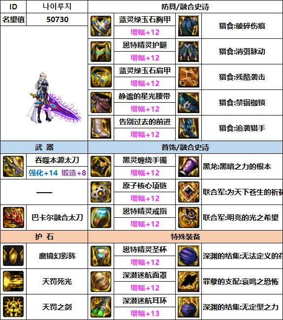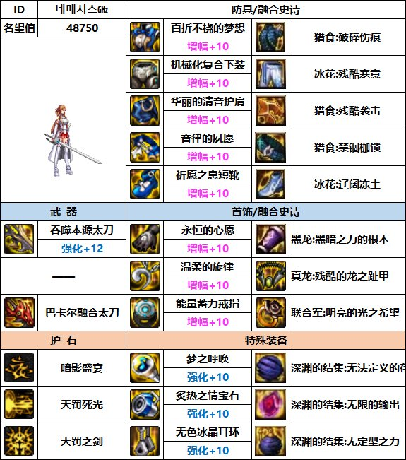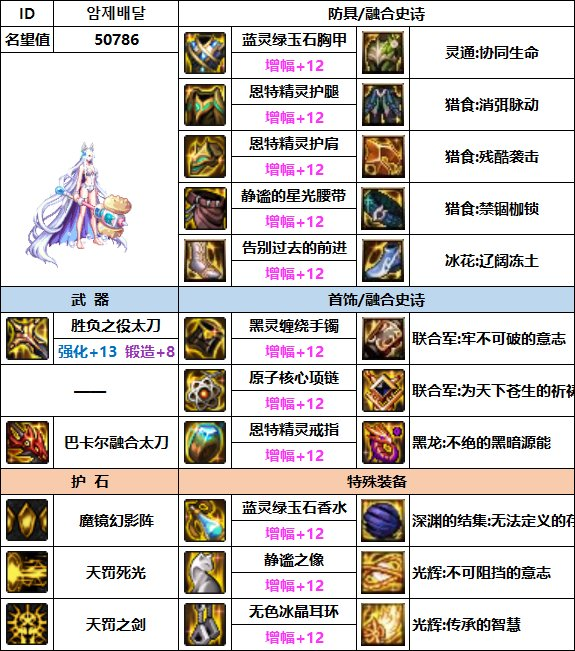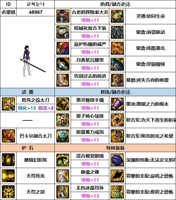 2、剑魂。 对剑魂这个职业,旭旭宝宝也很上心,装备增幅打造不低。跟红眼一样,走的是攻速出血流,头肩是“天才”,伤害跟属抗肩差距甚微,团本生存能力出众。