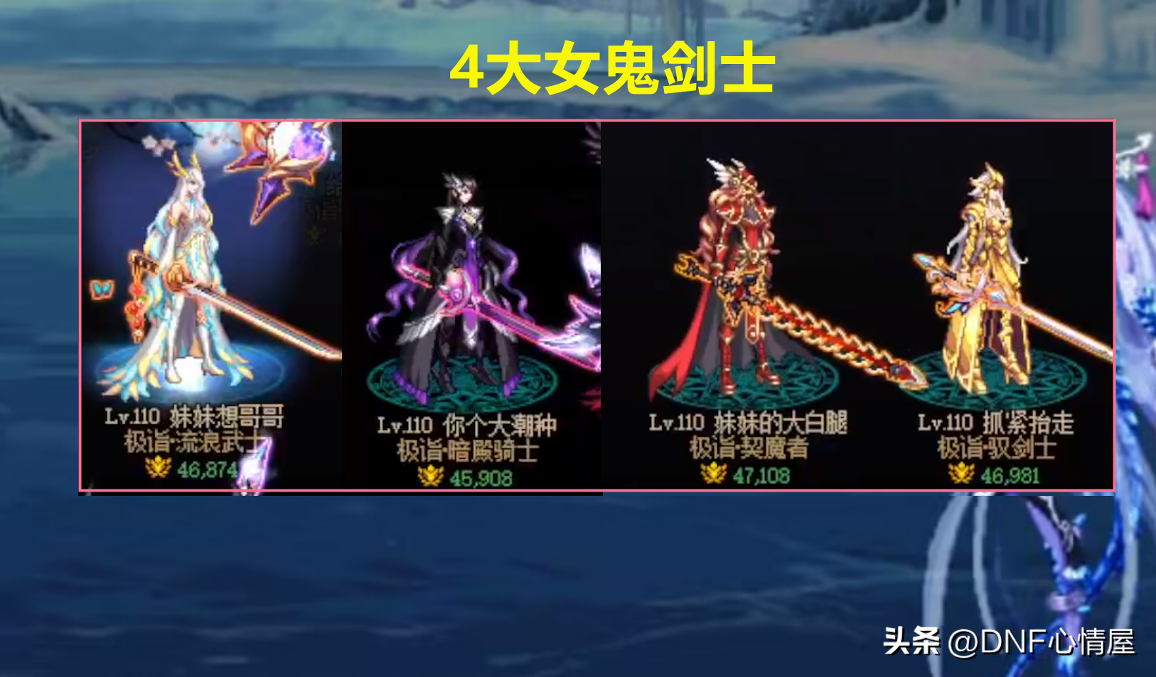 除了男鬼剑士以外,旭旭宝宝账号内,还玩了4大女鬼剑士,唯独刃影这个职业没有,当初在幻神的时候,并未选择去打造。