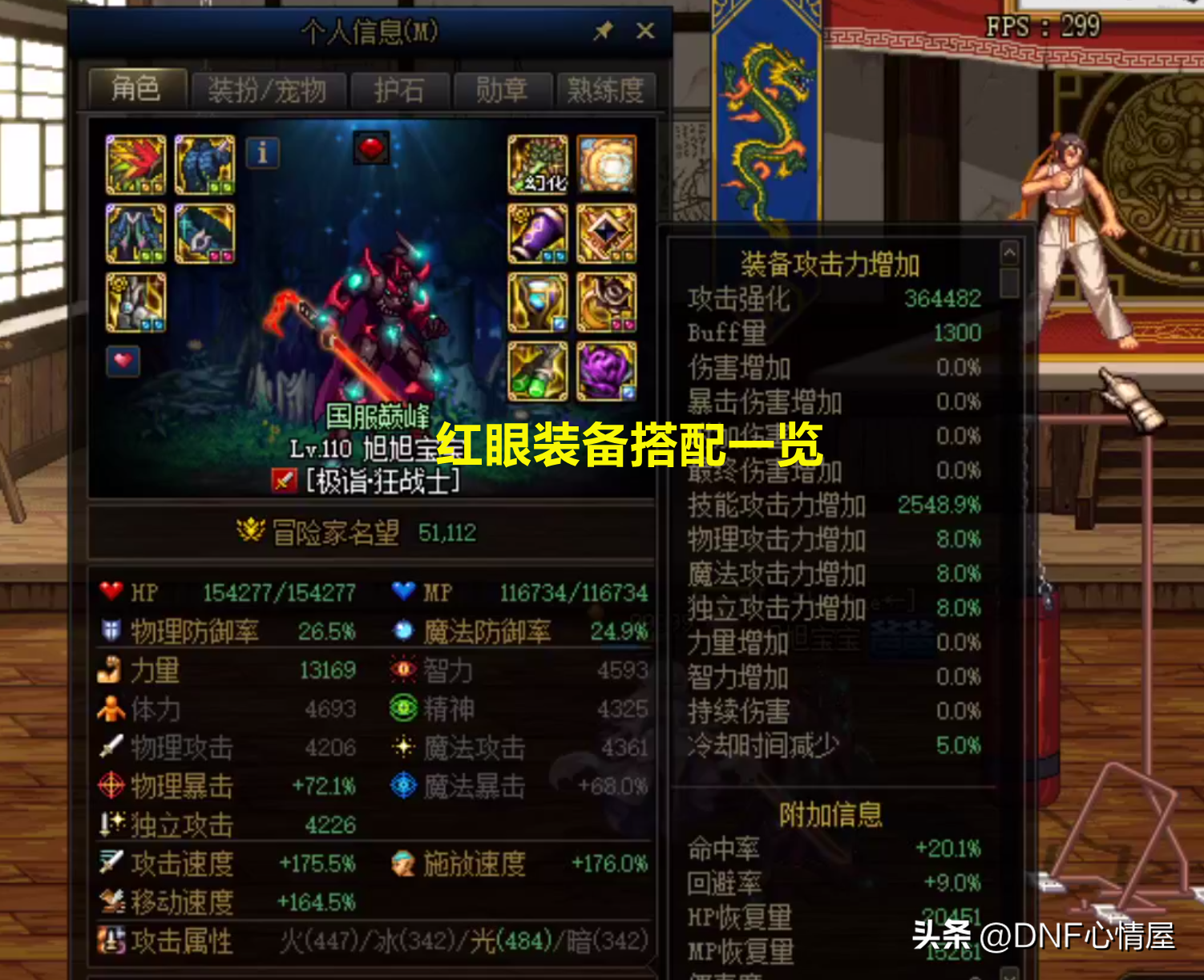 1、红眼。 由于是主玩大号角色,红眼增幅最高,全身红17~18,贴膜融合史诗已经8件,走的是攻速出血流,自定义史诗较多,且大部分词条完美,名望值位居全服第一,突破5.1W的界限。