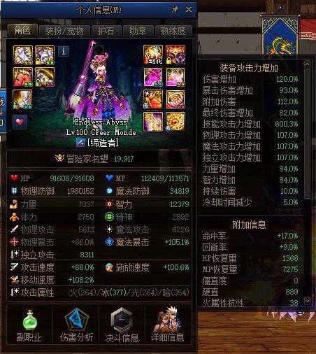 词条解析当前版本中,目前打开人物属性,在最下4个图标中的详细信息,打开后便能得到以上面板。推荐在修炼场或者地下城中打开,由于相当一部分装备属性为触发性质,在城镇不会显示,触发完后才为影响人物最后伤害属性的相关数值。详情伤害计算可以去看猫人的帖子,里面讲的很详细,这里只讲一些通识性的用语,方便一部分浅度玩家理解当前版本一些伤害相关内容。在左边人物栏下面,影响人物伤害的属性主要有力量(智力)、物理攻击(魔法攻击、独立攻击)、物理暴击(魔法暴击)、攻击属性火冰光暗。力量(智力):DNF有物理职业和魔法职业之分,其中物理职业适用力量,魔法职业适用智力,目前版本装备对力智影响很小,基本可以忽略,但是力智属性是打造属性(充钱)的主力,主要为增幅。物理攻击(魔法攻击、独立攻击):DNF在分完物魔之后有两种攻击类型,一种是物(魔)理百分比,一种是固伤职业,主要区别在武器打造方式,百分比职业适用武器强化,而固伤职业适用武器锻造。物理攻击对应物理百分比,魔法攻击对应魔法攻击,独立攻击对应全体物理魔法固伤职业,统称为三攻面板。物理暴击(魔法暴击):物理暴击对应物理职业,魔法暴击对应魔法职业。暴击是dnf相关伤害属性较为重要的属性,优先叠至100%,暴击不仅会使原本伤害变为原来的1.5倍,甚至会影响后续暴击伤害增加词条的的伤害计算。攻击属性火冰光暗:dnf的伤害攻击分为火、冰、光、暗四种,一般通过晶体契约、武器附魔、辟邪玉、人物职业自带者装备自带获取。属性右边括号的数字为属性强化值,一般只能通过附魔、礼包产物(不限于国庆光环、春节宠物)额外增加,装备本身也有不同。由于dnf在90版本之前怪物普遍存在属性抗性差距,四种属性攻击伤害会有所差别。但目前版本基本怪物属性抗性都一样,所以只用选择其中一种属性及属性强化值单堆即可。在右边小栏里,上面的装备攻击力增加是目前影响伤害最主要的属性。