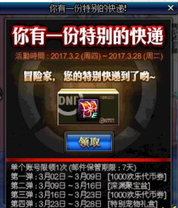 3月23日DNF特别的快递活动最后一个奖励:特别宠物礼盒,上线就能领取,那么他究竟能开出什么宠物呢?一起来看看: