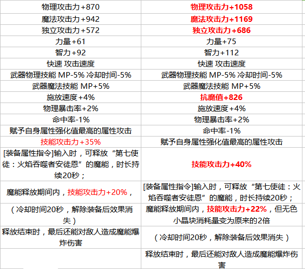 升级后的属性除了攻击力、四位提升之外,技能攻击力+40(提升5%),开魔能技能攻击力+22%(提升2%,无色消耗量变为原来2倍);其余属性没有变化