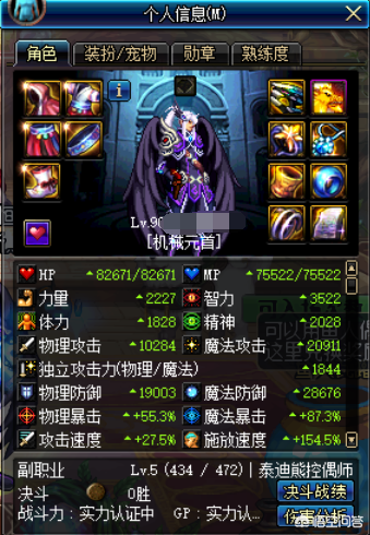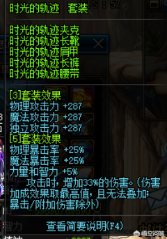 时光的轨迹是皮甲套装,不过机械是布甲,所有不是本命套,套装三件套属性提升三攻287点,五件套提升25%双暴,5%的智力还有33%的黄字伤害,那么看一下面板。