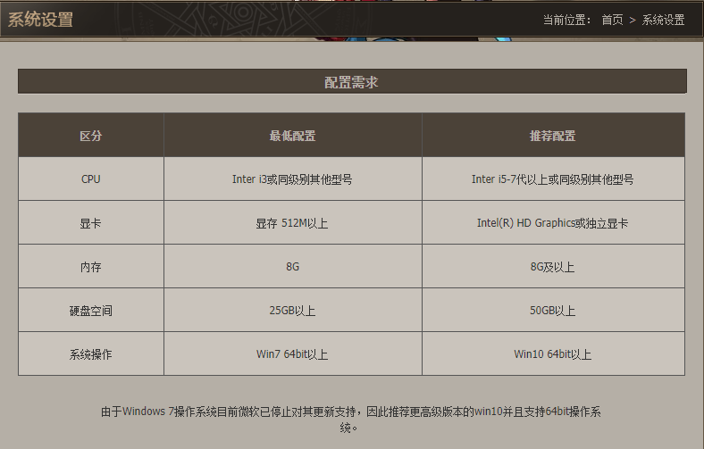 3.您可以在跳至的页面上查看DNF的配置要求。最低要求是:I3处理器,512M或更高的显存,8G内存,25G硬盘空间,win7 64位操作系统。