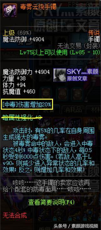 毒雾云绕手镯可使[中毒]伤害增加20%, 这条效果换个说法,就是只在中毒状态下 生效的异常状态伤害加成;而前面提到的布甲B套和重甲B套的效果,则是在中毒、灼烧、出血等所有状态都能够生效的异常状态伤害加成。那么还是简单地计算一下该手镯的提升率: