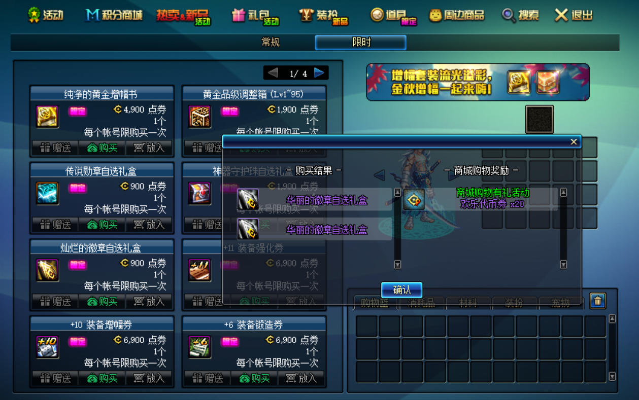 对了,最后还要告诉大家一件事非常有趣的事情,那就是双十一特惠商城中的限时商品购买不仅是非常大的优惠,并且还有10%的返利,比如这个200点券的华丽徽章礼盒,玩家在购买后会返还20欢乐代币券。