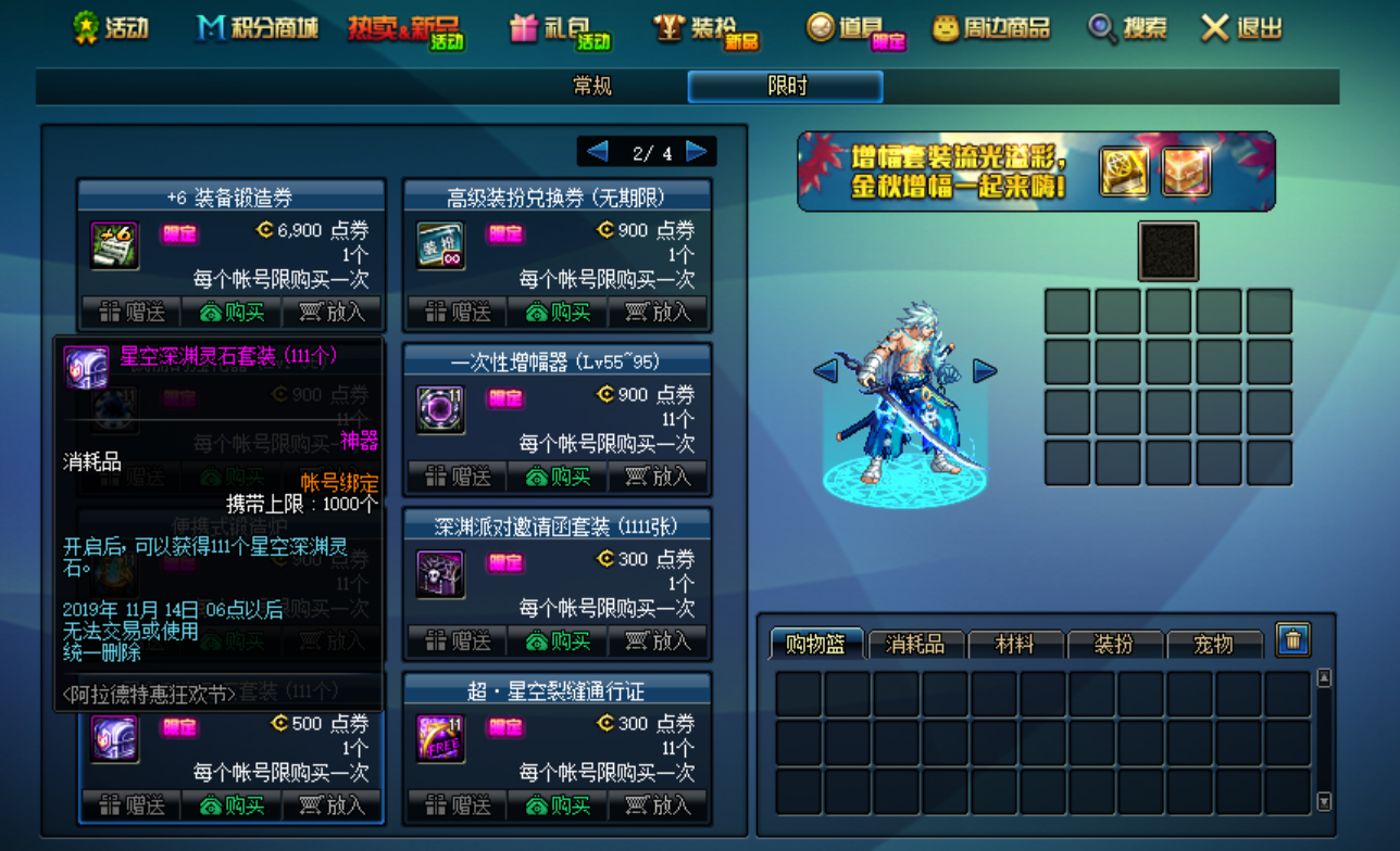 双十一特惠商店中的物品,仅有900点券的高级装扮兑换券是永久期限的物品,其他的强化券、强化器这类物品都是在11月14日更新删除,但是星空深渊灵石套装和深渊派对邀请函套装以及精炼的时空石礼盒打开后获得的物品都是永久期限的。
