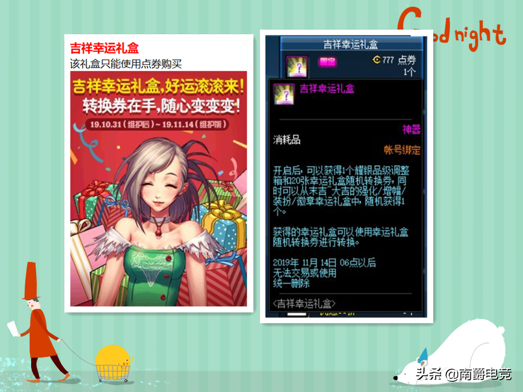 然后商城中还上架了一个777点卷的小礼包——吉祥幸运礼盒。今年这种类似的低价格高性价比的礼包非常多,这个礼包的内容也是不错的。可以开出耀银调整箱、20张幸运转换卷和幸运礼盒,这应该是又在玩概率了。