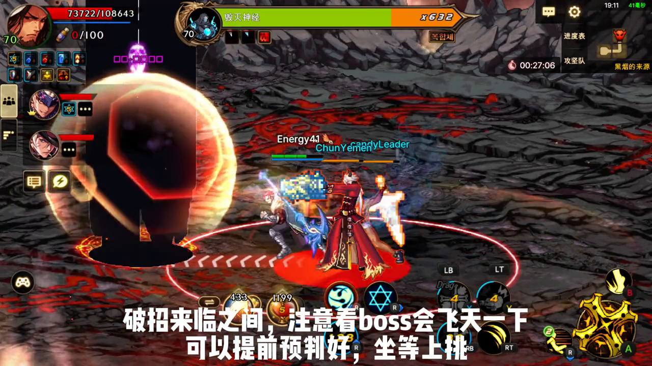 当屏幕出现三头动画时,大眼怪就要进行野蛮冲撞了,需要提前走到它的冲击位置进行破招,破防后进行输出。第二个机制是“精英怪黑烟”,没有什么秒人机制,比较好打。当四个角落出现四个球时,打掉它们即可。注意,当出现罩子时,需要打掉队友身上的,不能打在boss身上,火山门将没有什么特殊机制,按地上摩擦即可。