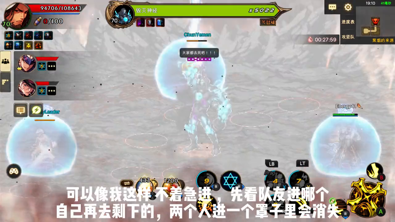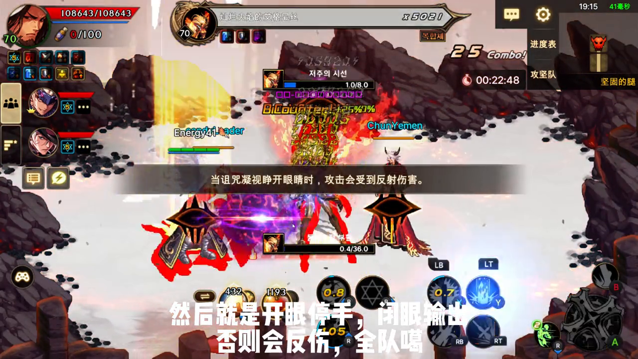 第四个机制是“巨斧洛克”,没有什么秒人机制,比较好打。按地上摩擦即可,注意把两个怪控制在一起打。第五个机制是“大眼怪”,前面要注意不要被抱住,被抱住就会被秒杀。当头上出现进度条时,不要和它对视,否则会损失很多血量。