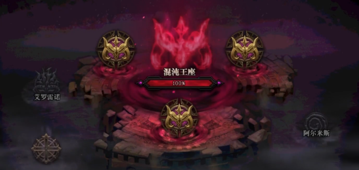 二阶段为混沌王座,限制通关时间为20分钟,三个队同时进入boss,三个boss图共享血量(类似希洛克)。但和希洛克攻坚战不同的是,只要在混沌王座中有至少一支队伍存在时,奥兹玛的血量便不会回复,即便所有队伍均退出混沌王座,奥兹玛的血量会缓慢回复而不是初始化。所以,在其他队伍攻略艾罗雷诺与阿尔米斯的时候,剩余队伍需尽可能活下去。