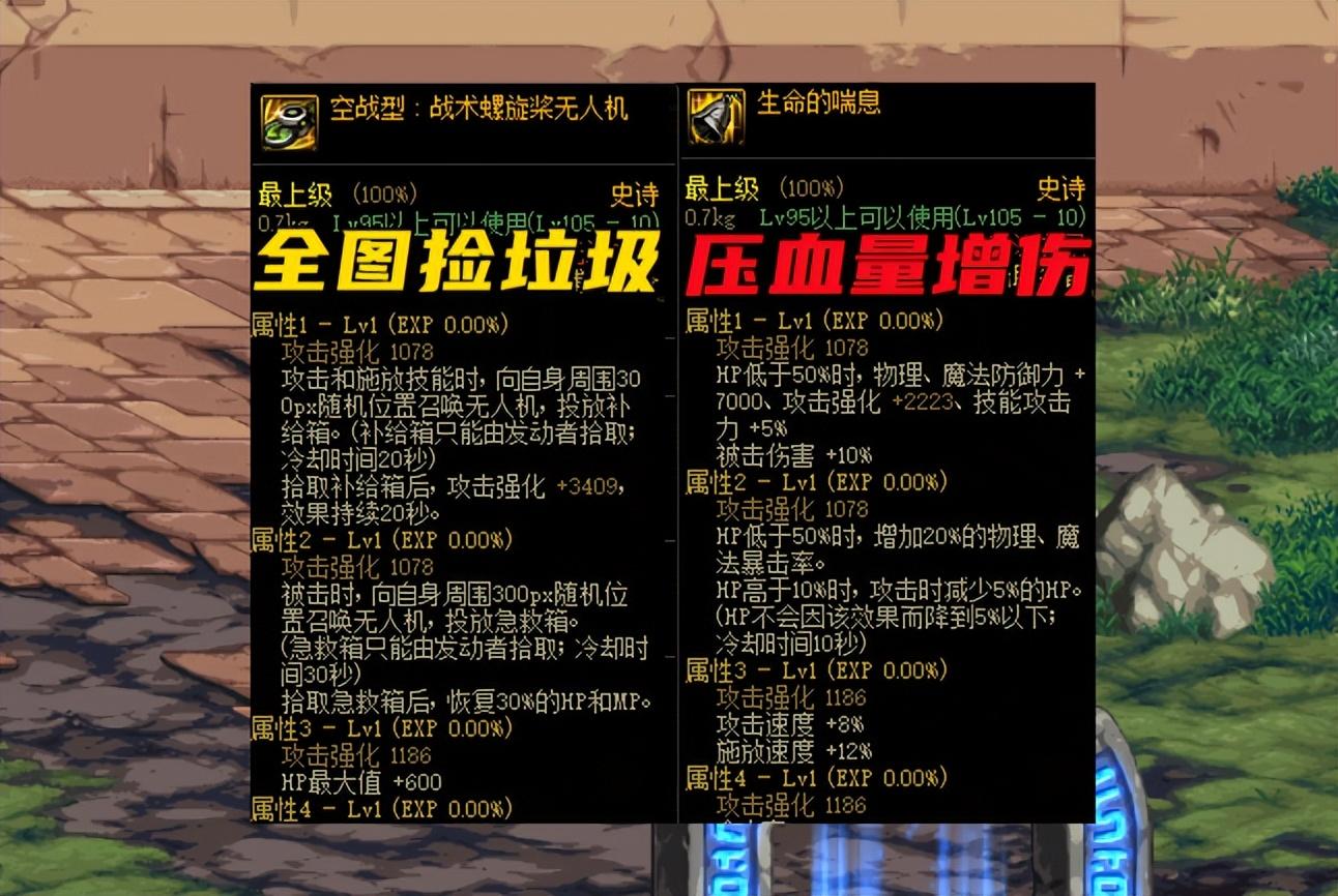 【5、战术螺旋桨无人机】:攻击释放技能时召唤无人机,拾取后增加3409攻击强化!同样是没有任何负面属性、也不需要特意触发的装备,但弊端在于,每隔20秒,就要捡一次“垃圾”,而且还是全图随机掉落,对操作有点影响。