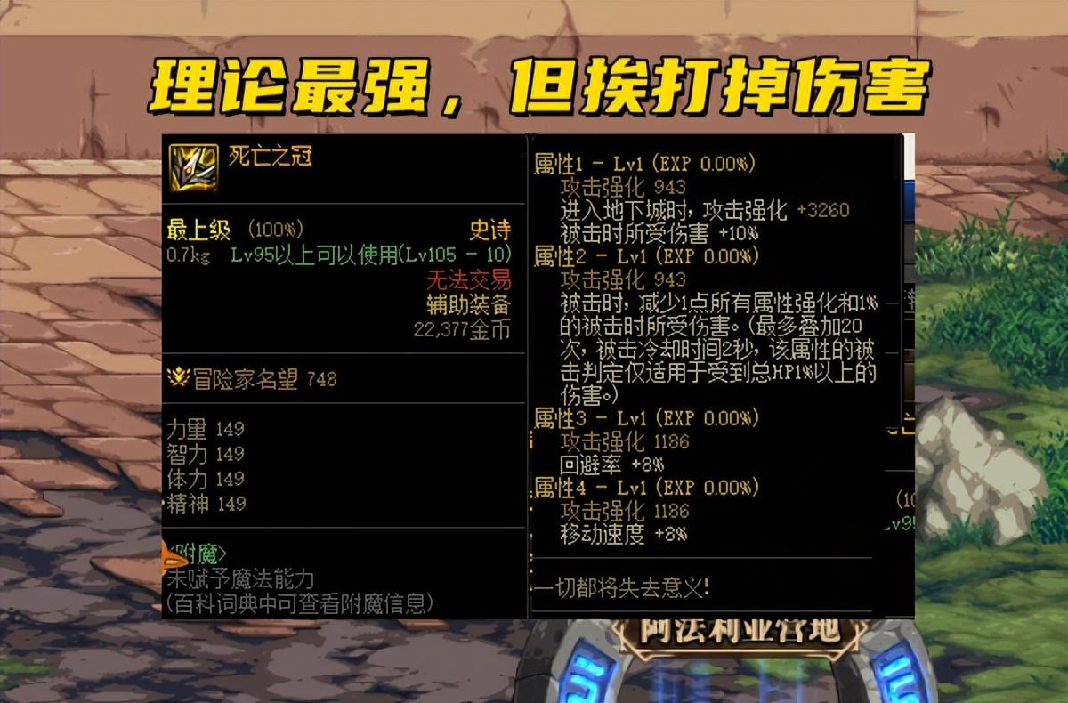 【2、死亡之冠】:进入地下城时,攻击强化+3260!这件装备其实是理论提升最大的左槽,而且也不需要触发条件和附魔,任何玩家职业都可以驾驭,修炼场表现非常好。