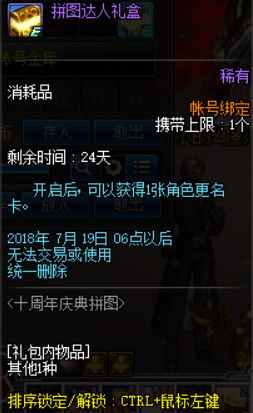 比较坑的是,需要拼出10个图片才能获得改名卡的奖励。想当初小编为了获得这改名卡,费了老大的劲去拼图。在此建议还没有完成的玩家,选择物品栏很空的角色,一次性打开几十个拼图碎片礼盒,然后从上到下依次拼图,这样就能有条不紊,效率杠杠滴。