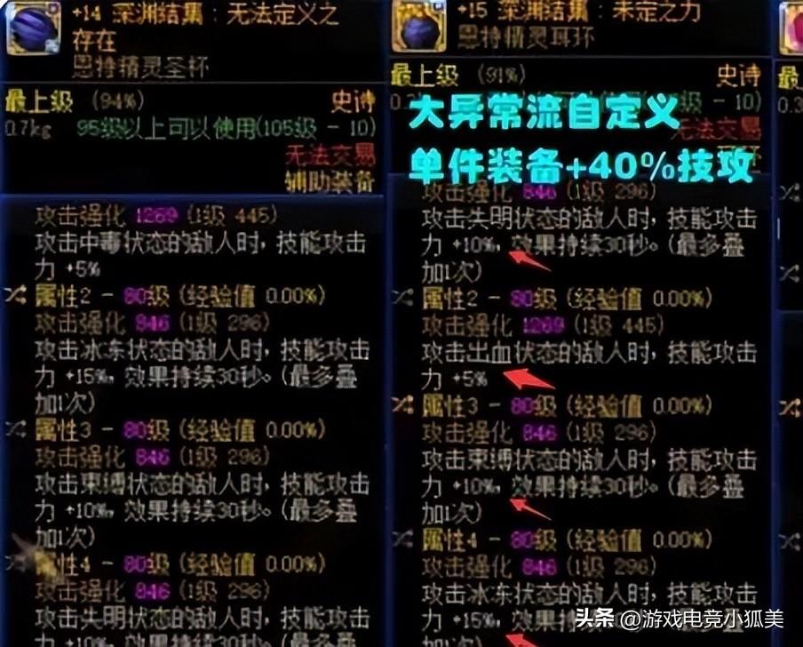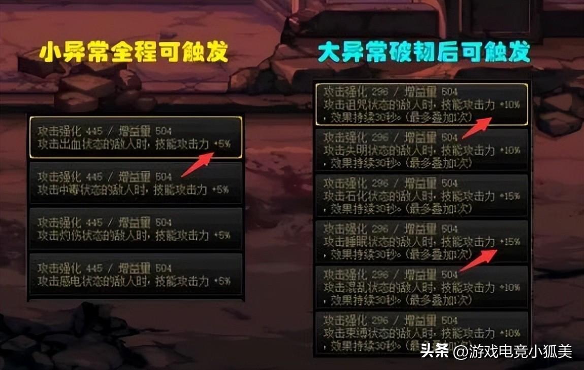 常规的异常流是出血、感电、中毒和灼烧,每种 只能提升5%的技能攻击力。但是,冰冻、减速、束缚、失明等非伤害性异常流,可以提升10%~15%的技能攻击力,所以被称为大异常流。自定义比较强势,比如【魔女左槽】冰冻15%、减速10%、束缚10%、失明10%。【恩特耳环】失明10%、束缚10%、冰冻15%、减速10%。一件就能提升45%的技能攻击力。
