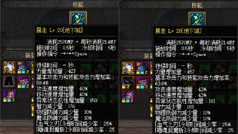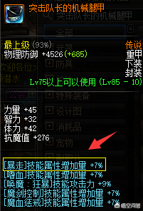暴走10级精通,上限20级,十级提升力量217点,技能攻击力:44.4%,其他小加成我就不说了,完美换装有突击腿,20级暴走,厄运6则达到594点力量,82.6%技能攻击力。