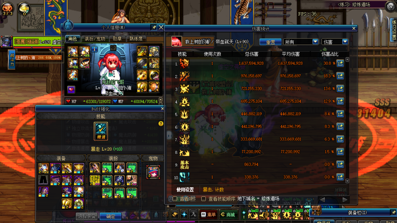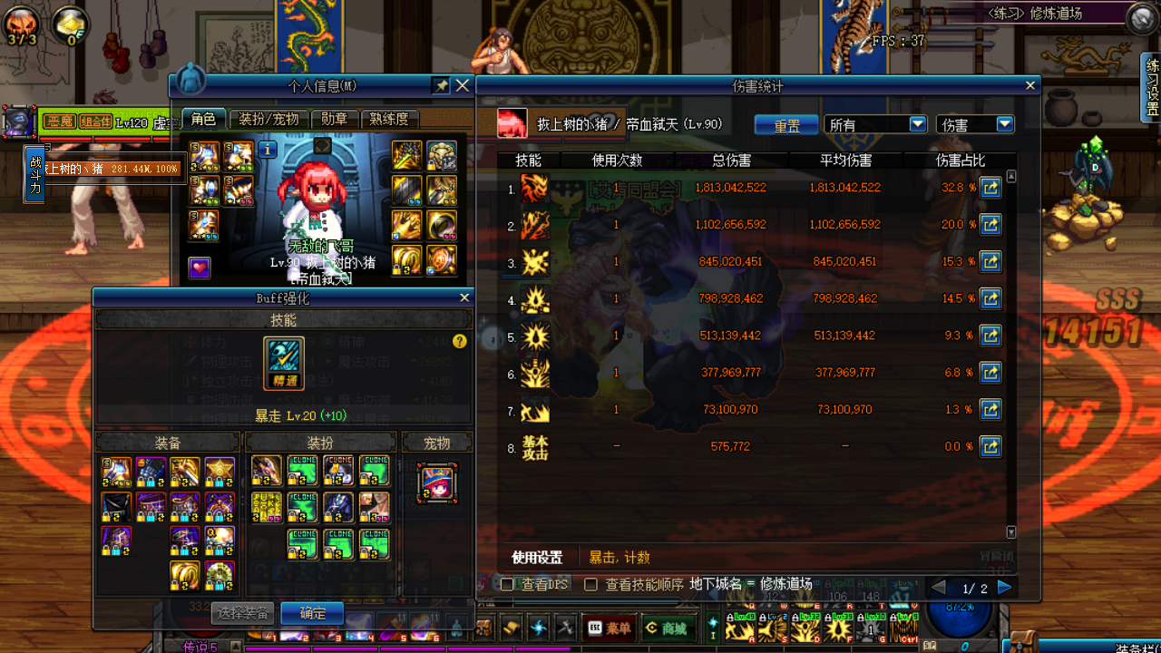 测试120级弗曼,开破招和命中暴击,避免两次测试一个出现破招命中和暴击,一个没有,这样测试数据肯定没办法对比的,那么没有暴走腿的情况下,这一身装备的红眼二觉伤害是16亿3759万