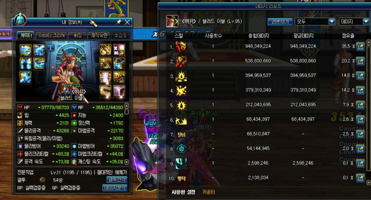 韩服的伤害测试来自猪猪侠神之手授权视频截图,这个测试的前提是比较垃圾的红眼伤害测试,站街仅有2400力量。在暴走改版前二觉伤害是9亿4834万