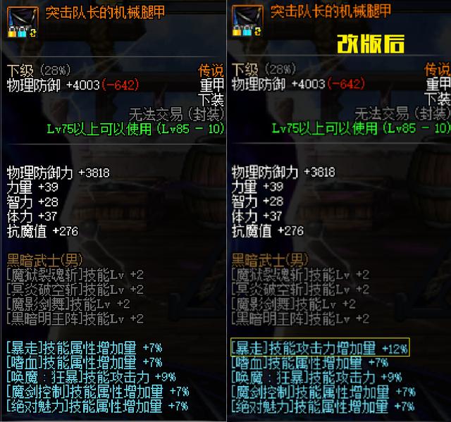 这个测试是16级暴走拥有突击腿换装,但是因为暴走改版不加力量,所以如果站街力量低的话,改版后伤害会降低。但是改版后打造比较好,力量高的玩家伤害是提升了,所以暴走腿的12%攻击力增加量成为红眼完美换装必备的装备。