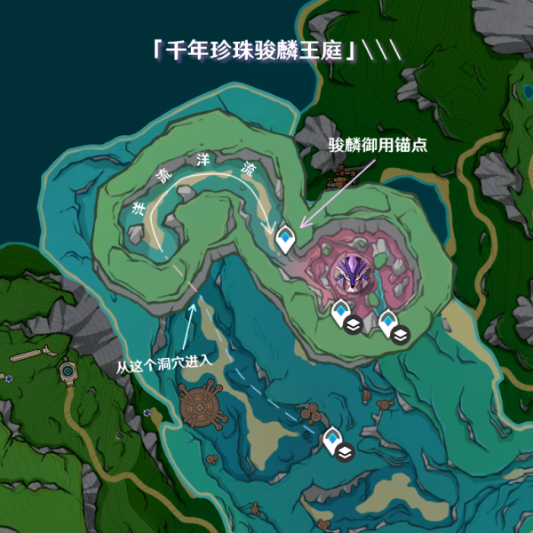 千年珍珠骏麟-基本信息 从黎翡区中部锚点开始,往西北游到图示指示位置洞穴,进入洞穴后会有洋流,随波逐流,游出即可看到一个专属锚点,再走一会可见千年珍珠骏麟。很巧的是,铁甲熔火帝皇的藏身处叫「铁甲熔火帝皇御座」,而千年珍珠骏麟的藏身处却叫「千年珍珠骏麟王庭」。▋异海珍珠: