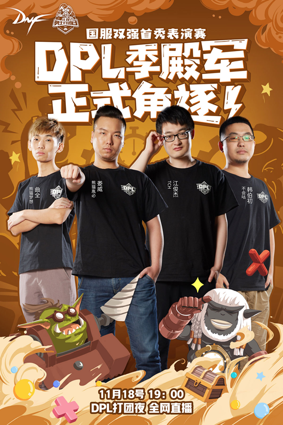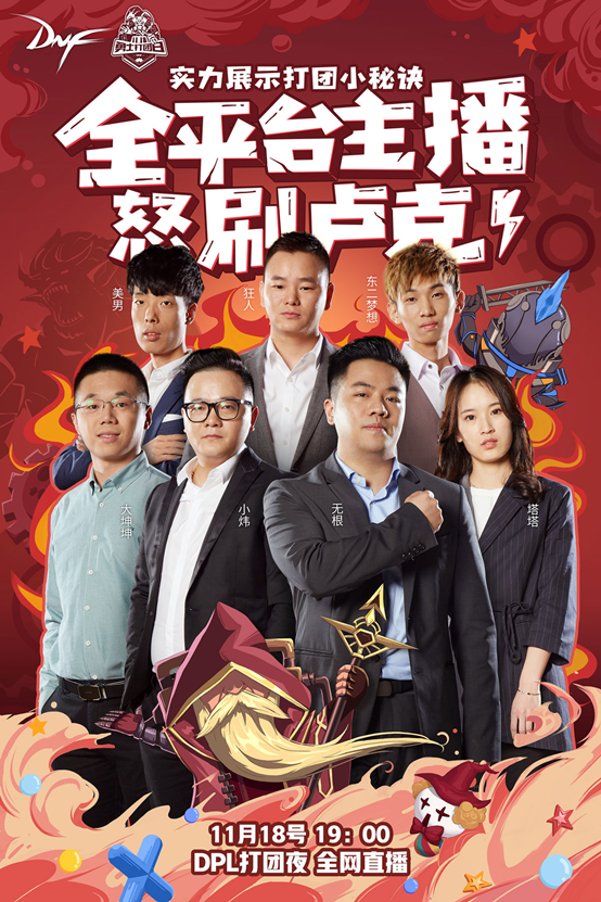 此次DNF DPL打团夜首播将在腾讯视频、企鹅电竞、企鹅直播、bilibili、触手直播、斗鱼直播、大神直播、虎牙直播、火猫直播、快手直播、狮吼直播、熊猫直播、一直播、战旗直播等平台全网播出。打团夜现场,还将带来各大平台人气主播们的打团表演,展示他们的实战小秘诀,与勇士们共同切磋打团技术。