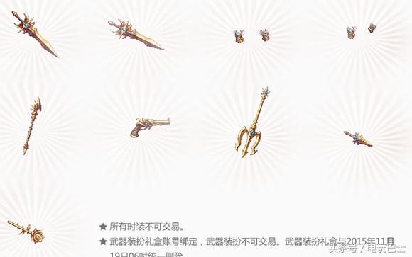 这套礼包的武器装扮是唯一一次全职业都非常好看的装扮,特别是圣职者的三叉戟,极度后悔错过了这次的礼包,因为当时小编被隔壁的撸啊撸拉走了。