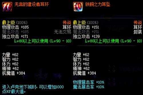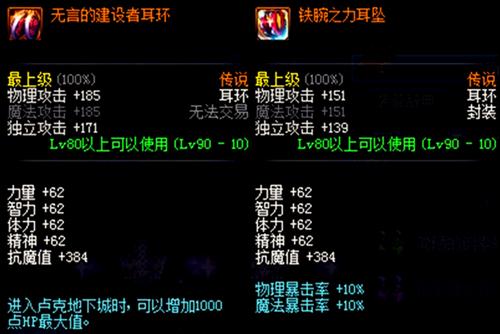 和无言的建设者耳环相比大概少了60的物理攻击力和20的独立攻击力,和铁腕之力耳坠相比大概少了30物理攻击力和10%双暴,但是独立攻击力却多出15点。总的来说艾肯传说副本的斗气耳环属性不错的,重点是爆率相当高,而且在合适的装备属性类型下可以自由转换需要的属性。