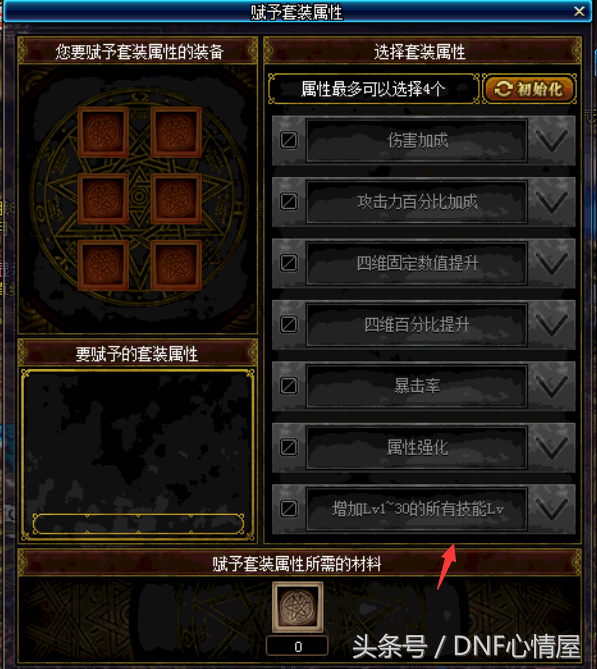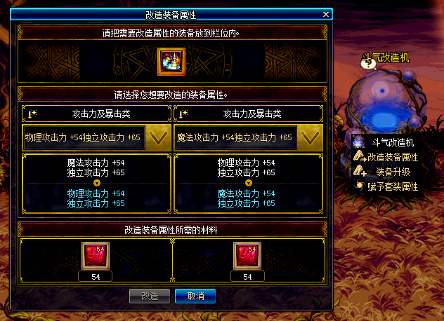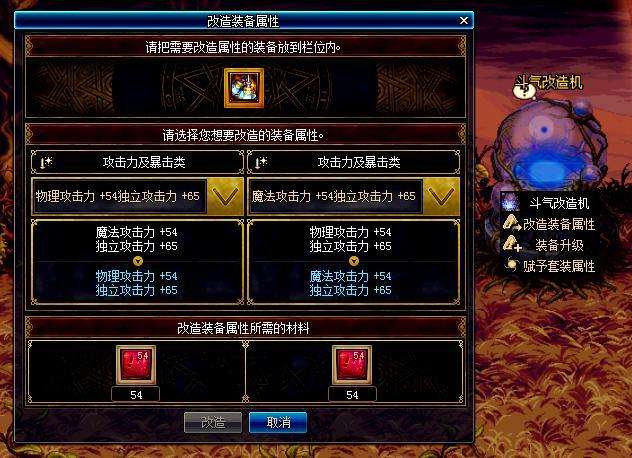 如果对装备的属性不满意可以使用斗气改造机进行装备属性改造,改造装备属性所需的材料也是使用特尔玛的象征在NPC休亚的商店中1比1兑换的。需要注意的是:装备属性不能转换成其他类型的,只能在本类型中改造属性,目前已知的装备属性类型有三种。