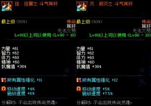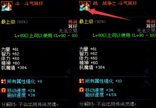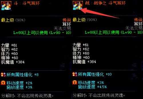 我们可以看到斗和战的属性对比,单从装备图标我们可以看到战的耳环比斗多了一颗星星,基础属性是没有变化的,而装备属性中所有属强提高了2点,移速提高了1%,施放提高了1.5%。