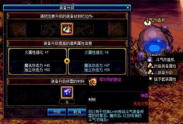 可以通过副本入口处的斗气改造机升级装备,材料需要用塔尔玛的象征到附近修亚商店兑换。
