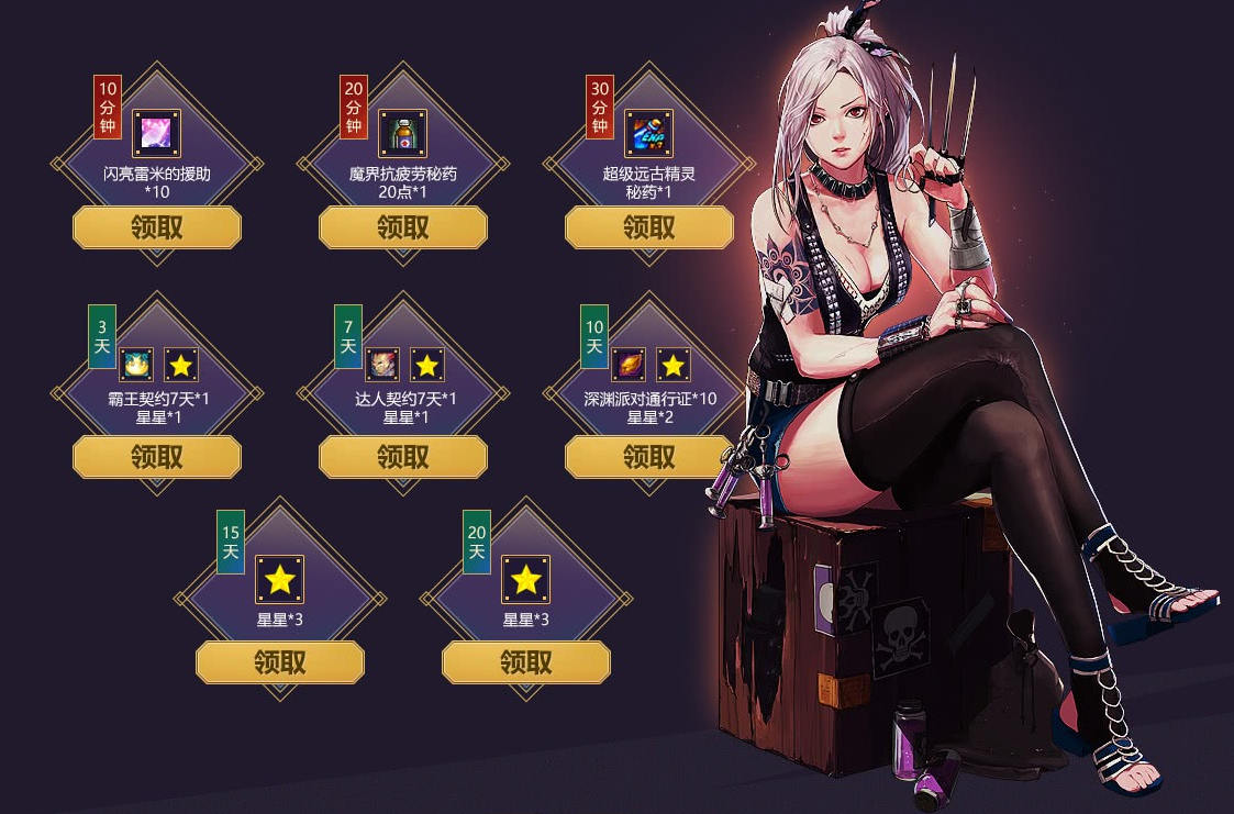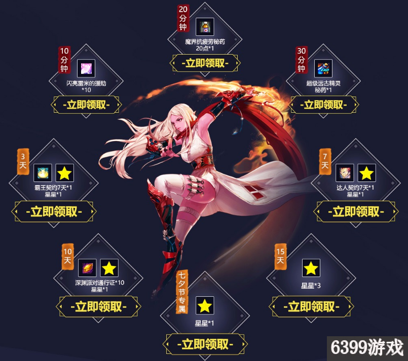 3、活动期间:每日登录游戏并在线10分钟、20分钟、30分钟即可以领取对应礼包1份,单Q每日限领1次,玩家累积3天取在线30分钟礼包即可额外领取一份礼包,单Q限领1次,七夕节登录游戏(8月28日)可额外领取1颗星星哦,消耗星星可在下方抽年费超级会员+兑换深渊