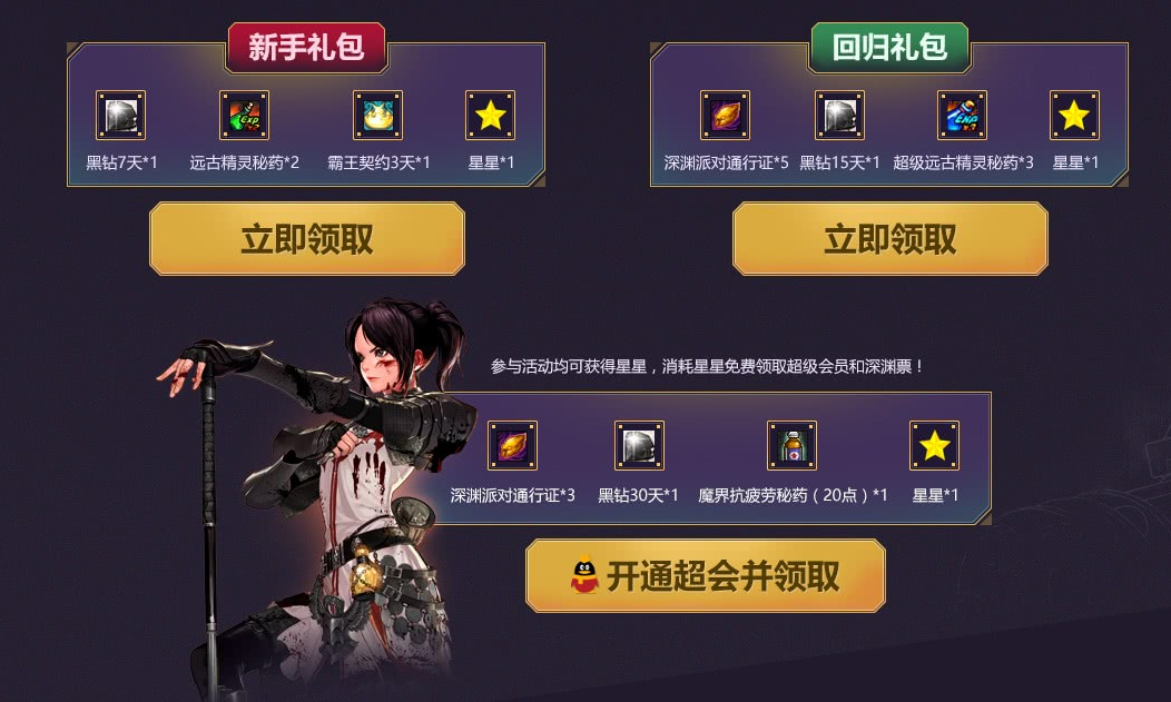 3月12号又开启了新一轮网页签到领奖励的活动,一起来看一看这次的活动详情。新手礼包包括7天黑钻、两个双倍经验药、3天霸王契约和一个星星。回归礼包包括5个深渊派对通行证、15天黑钻、3个三倍经验药和一个星星。