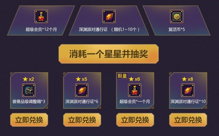 消耗一颗通过在线和开通所获得的星星即刻免费抽会员哦,消耗3个或6个星星可以兑换相应的礼包哦~,每份礼包单Q限5次